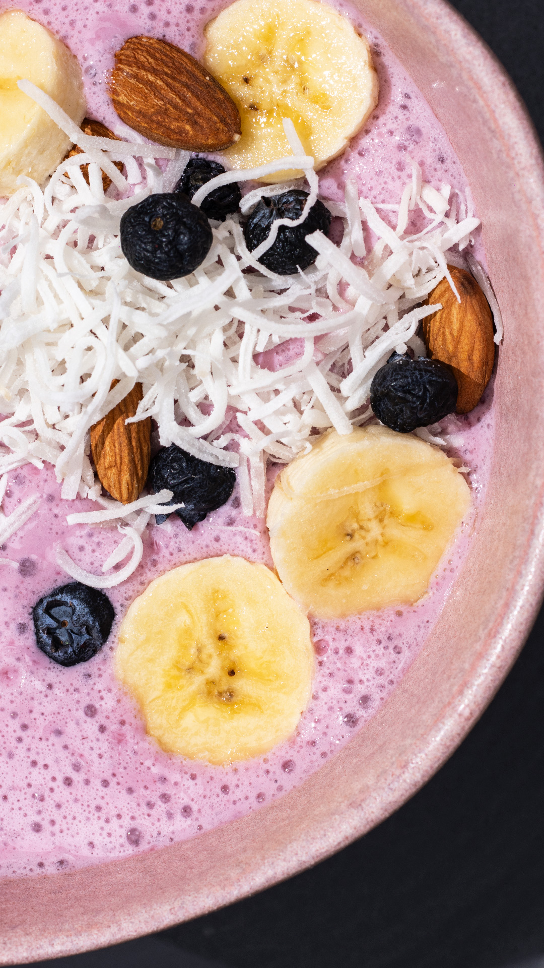 Batido de avena y moras, acompañado de 1 scoop de proteína, almendras, coco rallado, mantequilla de maní, banano y arándanos.