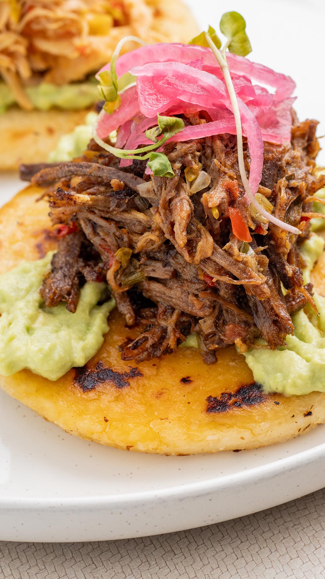 Deliciosa arepa asada con mantequilla acompañadas de guacamole, carne desmechada y cebolla