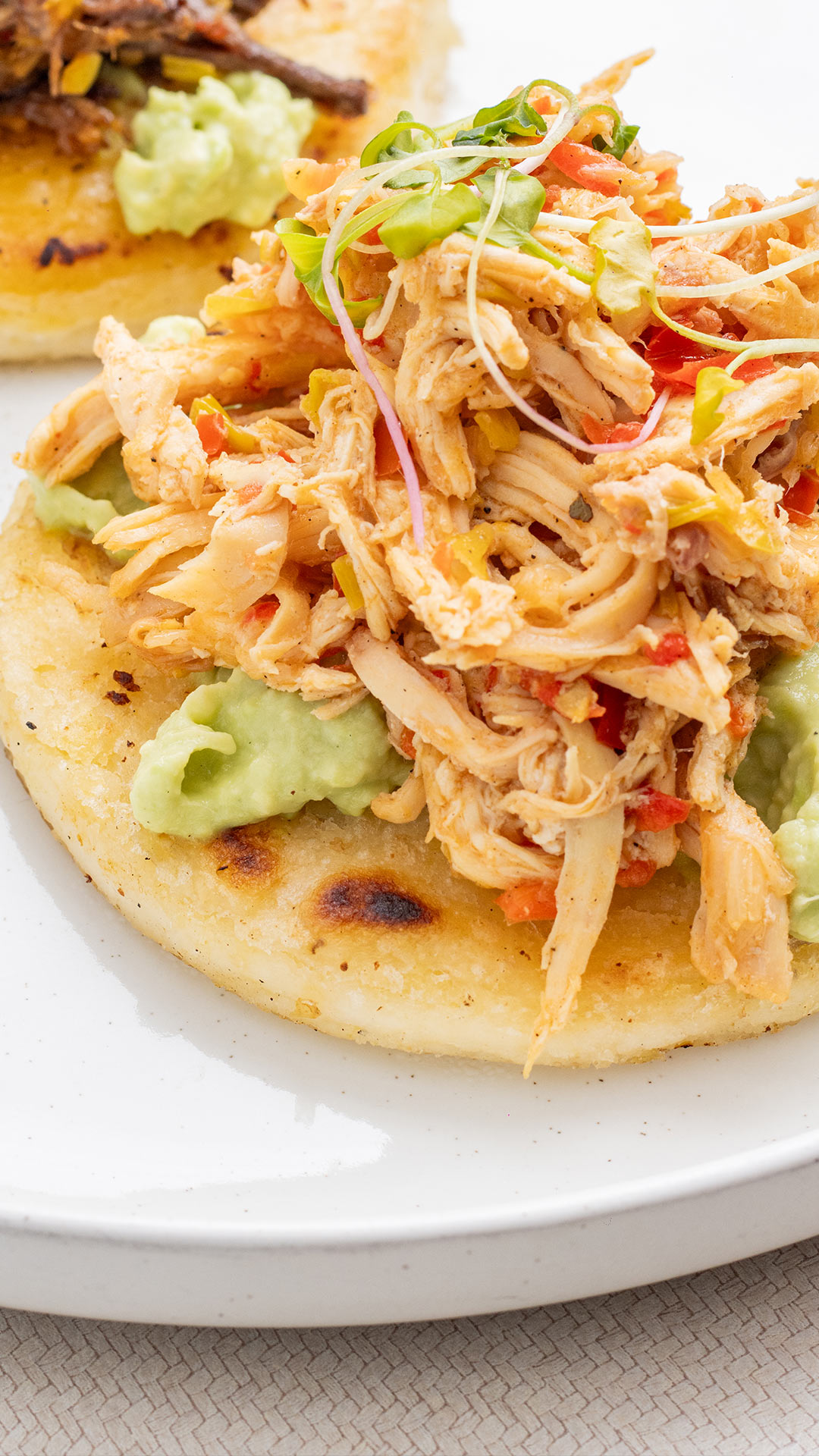 Deliciosa arepa asada con mantequilla acompañada de guacamole , pollo desmechado y germinados.