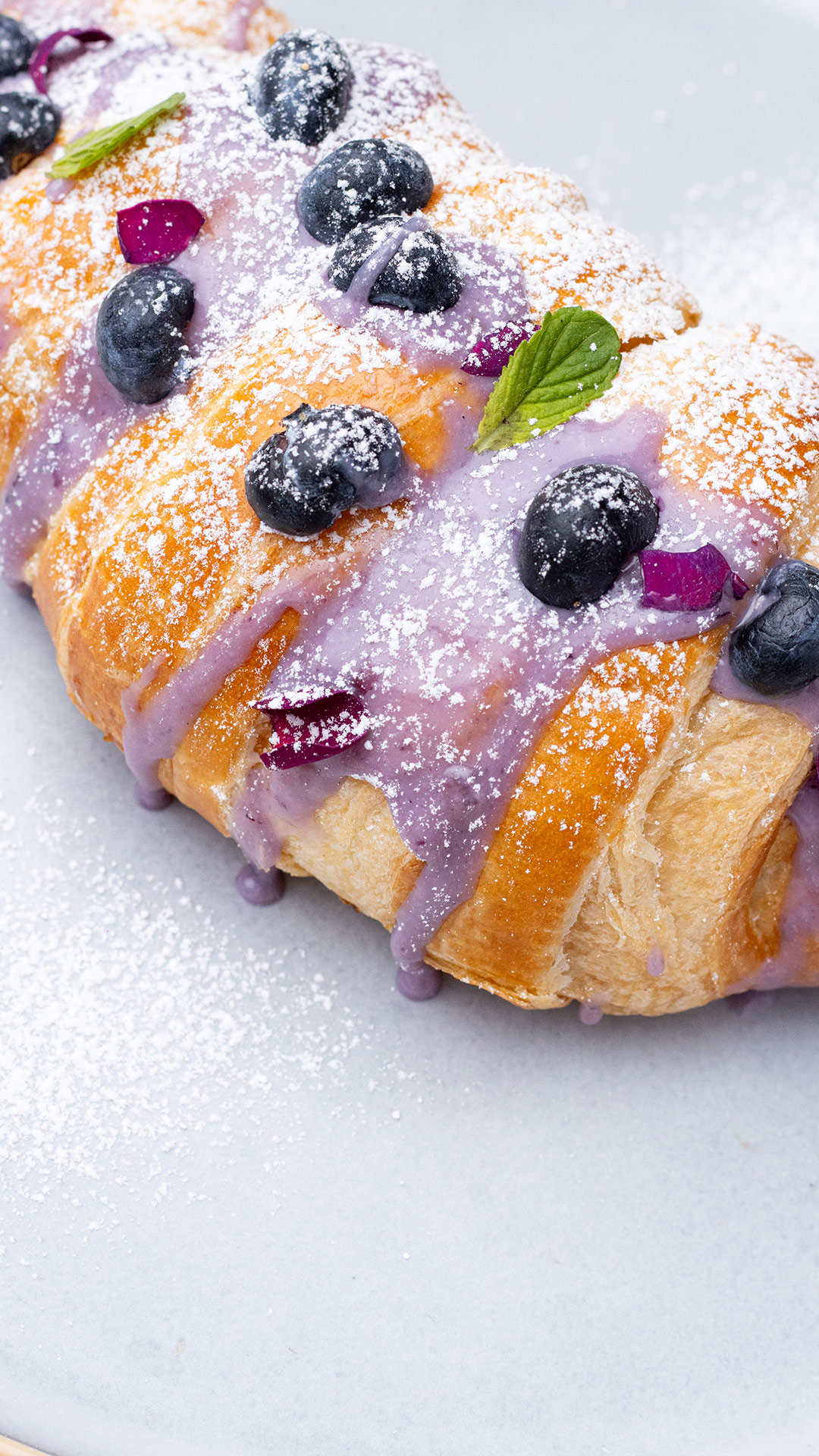 Croisant de mantequilla relleno con crema de arandanos y azúcar pulverizada.