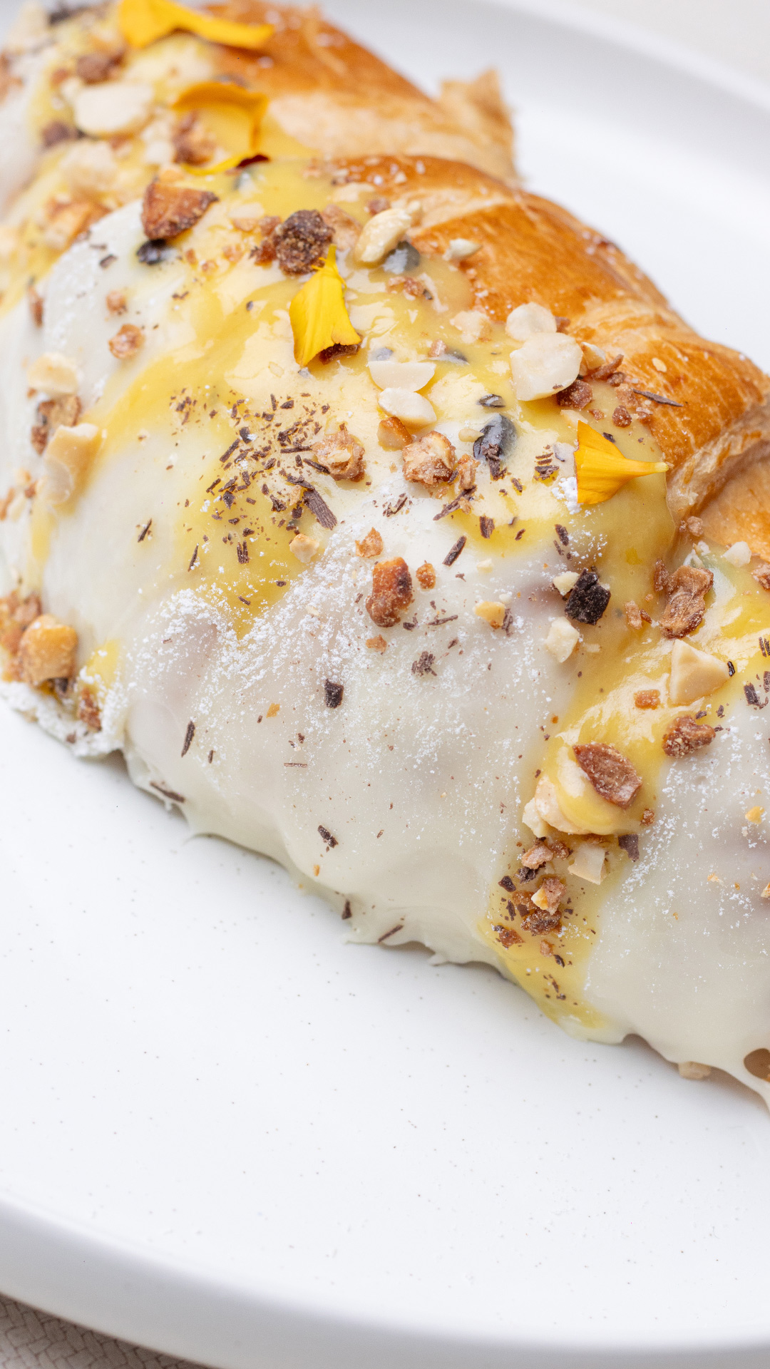 Croisant de mantequilla cubierto con chocolate blanco y crema de maracuyá.