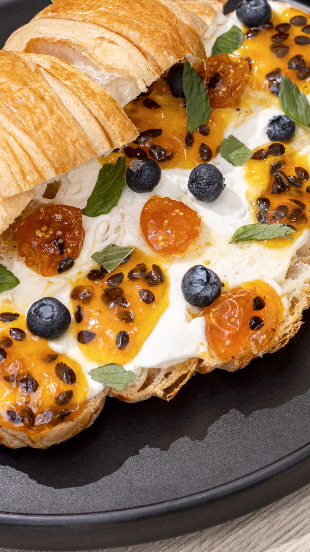 Delicioso croissant relleno de mermelada de frutos amarillos, acompañado de salsa de maracuyá, queso
