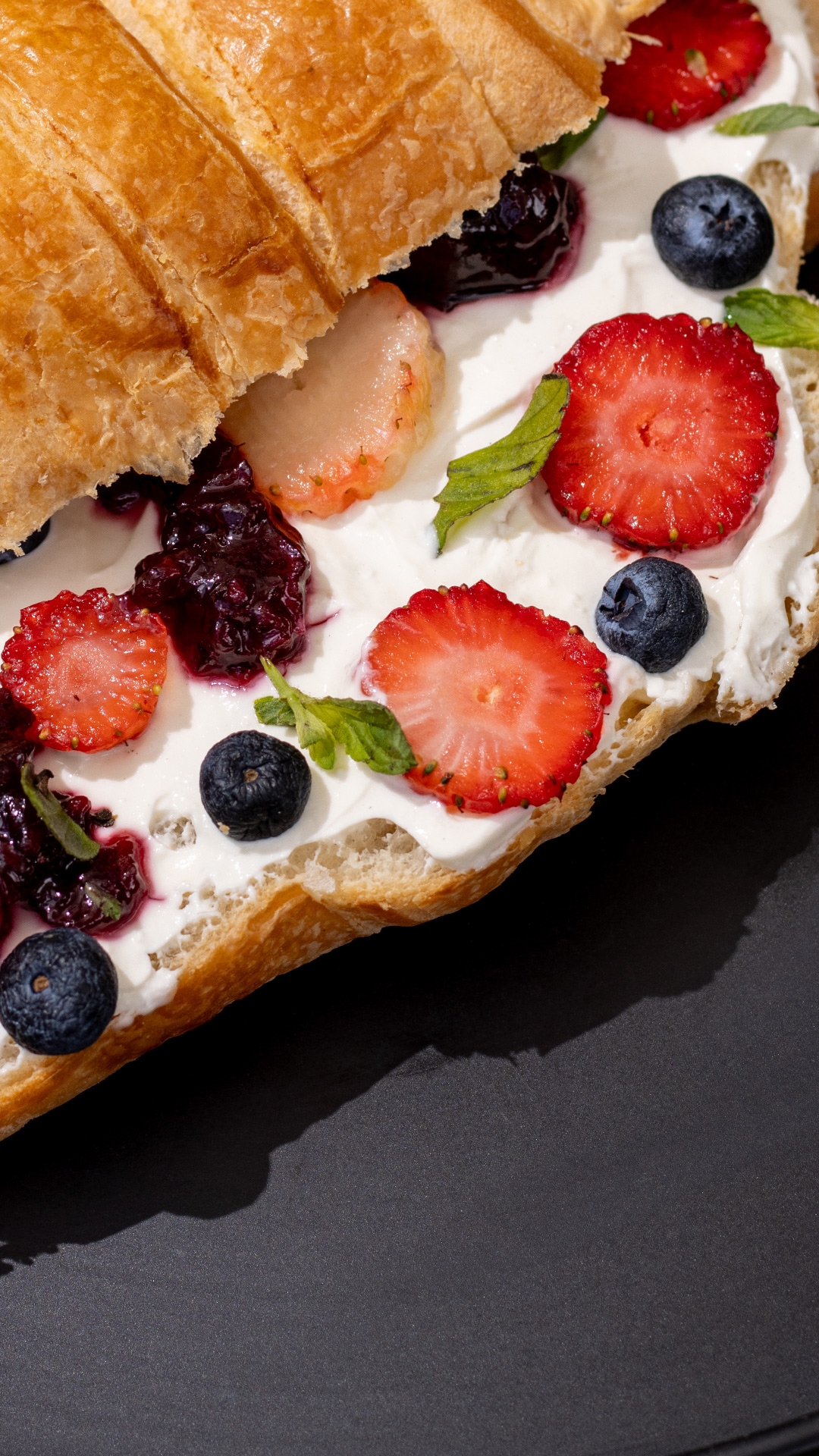 Delicios croissant relleno de mermelada de frutos rojos, acompañado de fresa, arándanos, tierra de