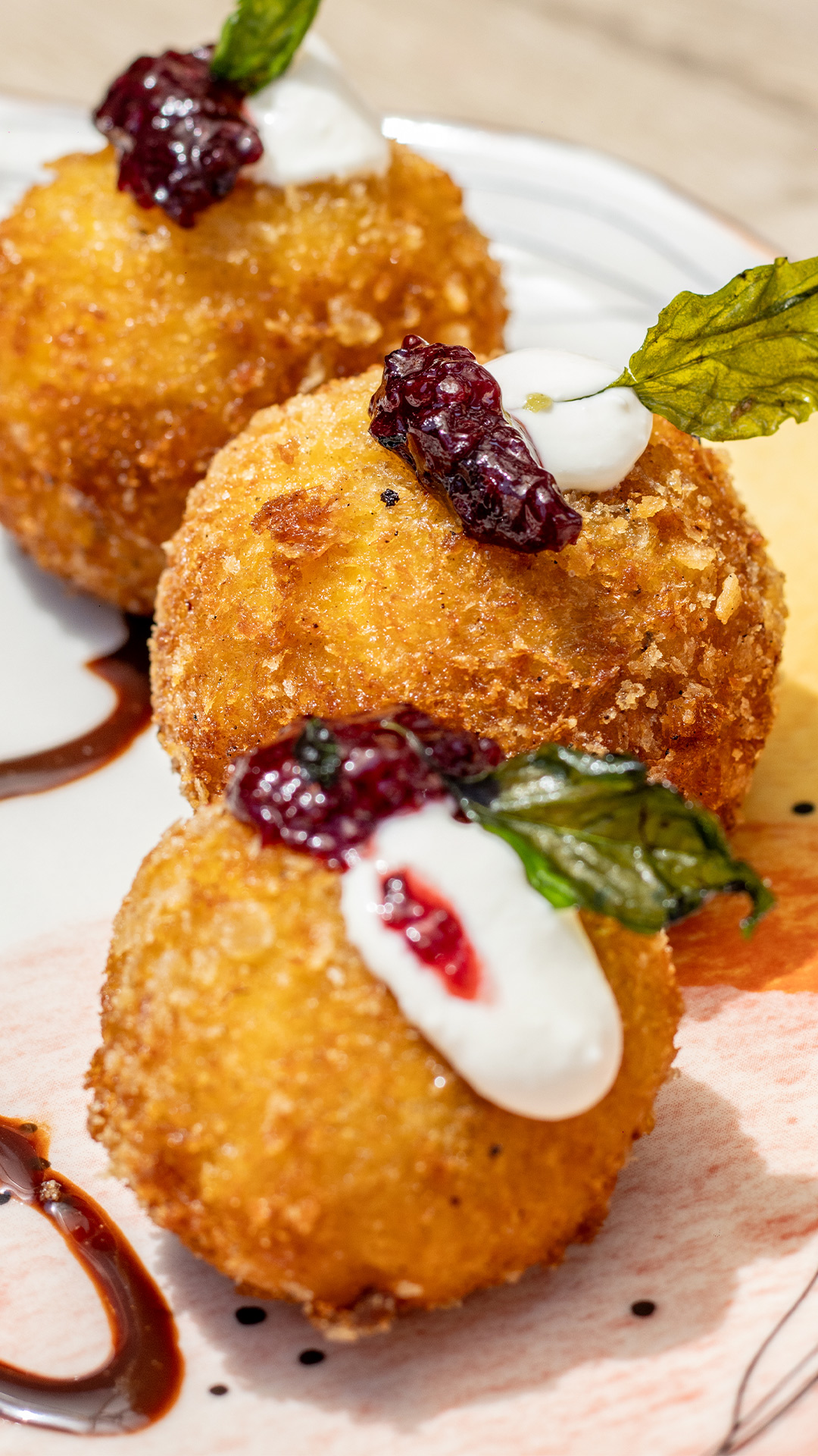 3 unidades de plátano maduro rellenos con queso, una base de queso crema, acompanados de dulce de